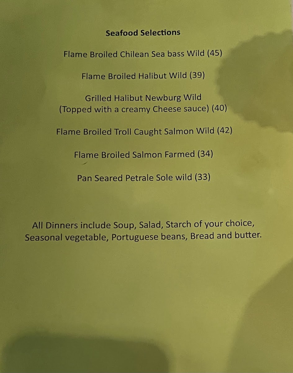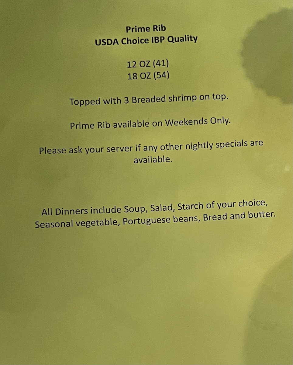 Main courses focus on steak and seafood options, including dishes such as prime rib, New York steak with baked potato, steak and lobster combinations, beef tips stroganoff, chicken marsala, and shrimp and scallop entrees. Traditional sides like Portuguese beans, potato skins, Portuguese bread, and salads with various dressings complement the main dishes.
