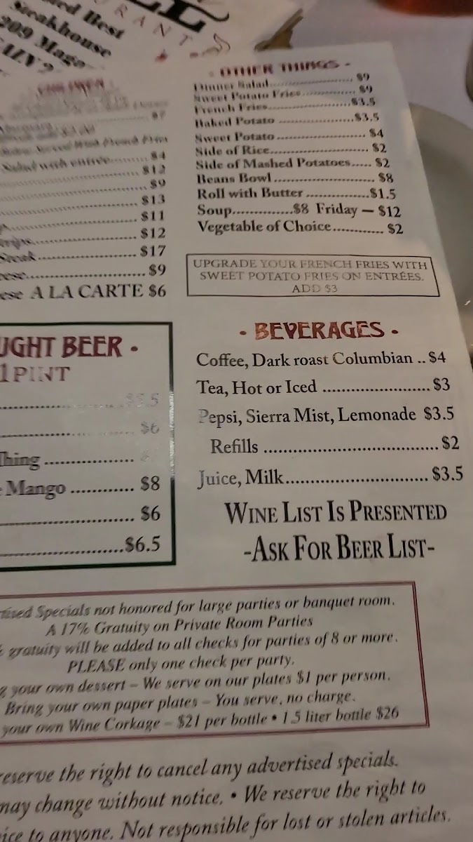 This menu is suitable for guests seeking a full-service dining experience with multiple courses, including appetizers, entrees, sides, desserts, and beverages. It supports a relaxed, sit-down meal where patrons can enjoy a range of traditional steakhouse items alongside regional culinary influences.