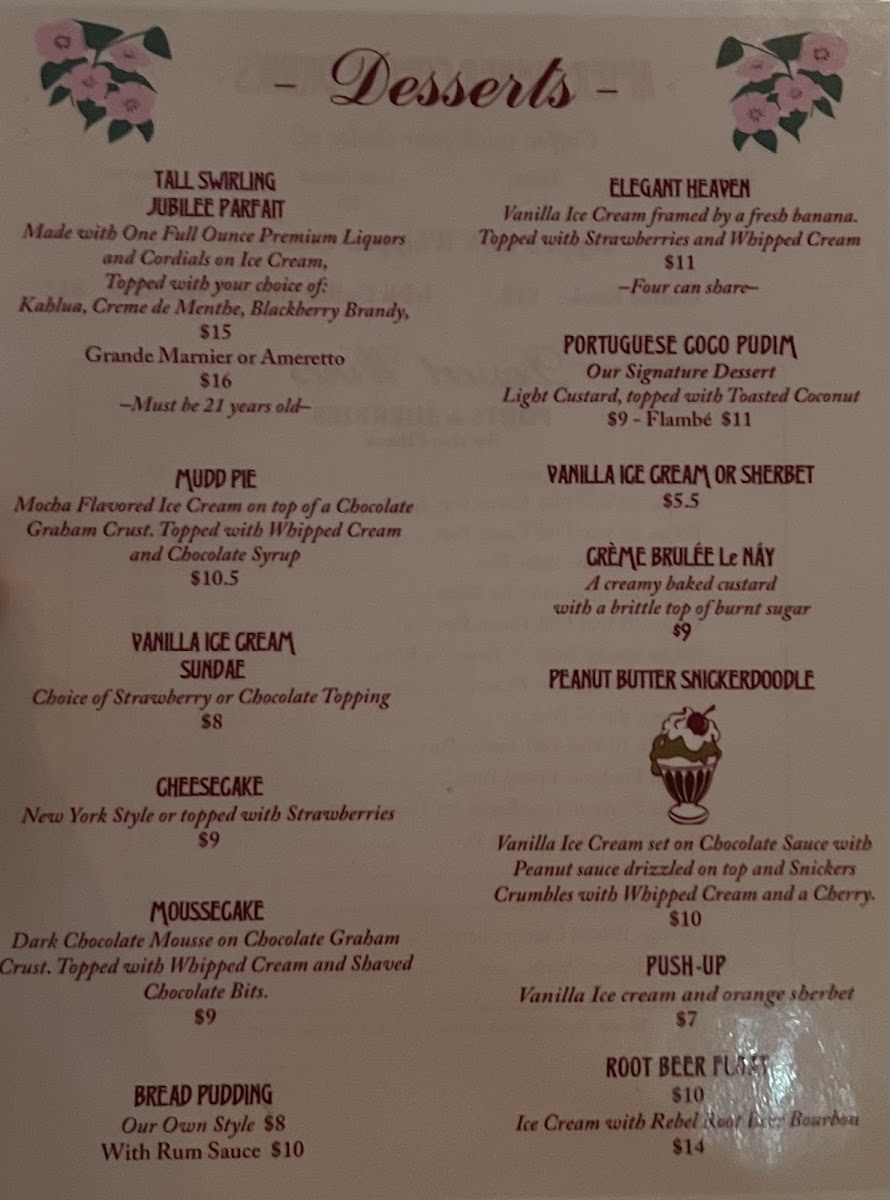 The dessert menu offers a range of sweet options including parfaits, mud pie, cheesecake, bread pudding, and other specialty puddings and treats, providing a variety of textures and flavors to conclude the meal.